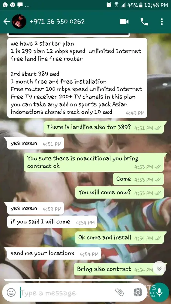 I just want to complain your agent from du named farhan. I respectfuly ask him if thr installation is free and only the internet plan of 389aed is the only amount i will pay he said yes. So i decided to ask him to come over and apply for connection. After a month it turns out i need to pay 600aedplus including installation which be told me is free. He is lying and cheated to us. Please refer to photo I will attahed. Please please do something about it.