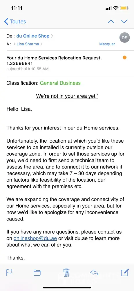 I've been given so many excuses as to why I have not got my service relocated (wrong address in system even thought I confirmed in 2 separate calls prior to initial installation date, that's my building is not registered for du services, that the building is not ready for service, that's there are fiber optics problems with my flat, that's du is having technical problems internally.