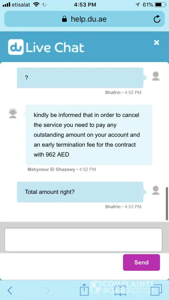 I have just recieved a call to say that Du will wave the 600Dhs break clause that they were going to charge me however this does not take away the upset you have casused in the interim and the incompetence of your staff dealing with this issue.