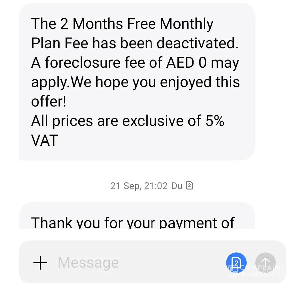 "The 2 Months Free Monthly Plan Fee has been deactivated. A foreclosure fee of AED 0 may apply. We hope you enjoyed this offer!