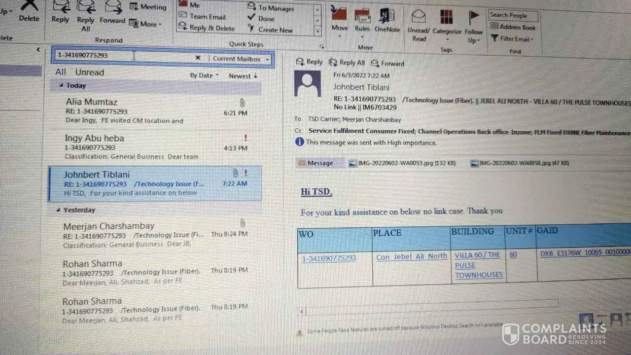 We reported the issue that there was no internet on Wed 6th April and after 2 technician visits, on Friday 8th the issue is still not resolved and we have had no phone calls or updates on this, despite calling Du everyday for last 8 days. please get in touch urgently or ill be writing more complaint to dubai consumer dept, Thank you