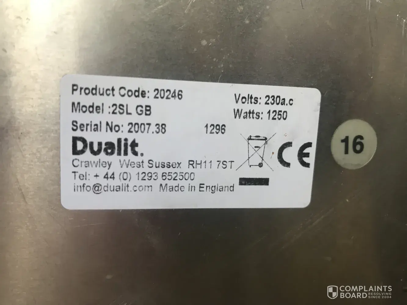 Dualit refuses to admit it has a problem with it's appliance. If I had been out half hour longer, our house would have burnt down. Our dogs were affected by the smoke in the kitchen created by the toaster burning the kitchen units. It was a terrible experience. I took great pleasure smashing the Dualit toaster up with a sledge hammer. Will never by a Dualit appliance again, it was a rubbish toaster anyway. Replaced it with a £15. one that is miles better. I now do my best to warn people about their defective appliance. DON'T BUY ONE. The company has no customer care, literally! Paula