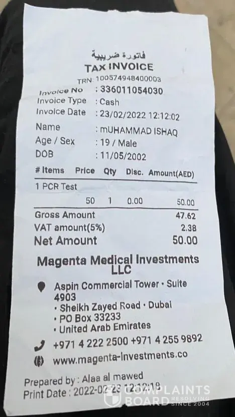 A Muslim man with red hair told my mum she did not have her OCI stamp and why she did not have her expired passport with her. She had all the documents with her and OCI should not concern Dubai airport staff She had all the documents with her and OCI should not concern Dubai airport staff! He questioned her and totally confused her. My dad is 87 and mum 83 years old. He then started typing information like my name and my UK address, all the details from my mum's passport. This is identity theft. I understand why he took details. He wants to create a fake receipt to show his boss money he took from my mum most probably went in his pocket. He is a thief. Not sure how much money he took. Had to be over AED50 Which my parents did not even have as departing from Dubai so they paid with English pounds as well. He tricked her by saying something about a PCR. He did not get her to do one and took the money. He gave her a receipt which I can attach. This belongs to a Muslim man aged 19 years old and a name nothing like my mother's. Why has your staff done this. Why have my elderly parents who are harmless been treated like this in Dubai airport. I thought Dubai is supposed to be safe and civilised. You should be ashamed of yourself for having staff like this working in your airport and your country. They have treated my parents horribly. How many other elderly people are tricked like this daily. Shame on him, shame on you and shame on your country. I want a full refund, a comprehensive apology to my parents and compensation for causing blood pressure to rise for my mum, distress and ill health on their journey to India and continued ill health. I am totally disgusted with his behaviour and demand and immediate response from senior staff. You will have evidence of this criminal activity on your CC TV. The address of the company on the receipt my mum has is Magenta Medical Investments LLC, Aspin Commercial Tower, Suite 4903, Sheikh Zayed Road, Dubai PO Box 33233 UAE