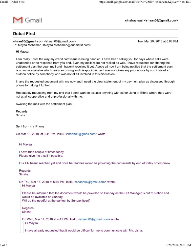 Then I had received a call from Dubai First whose name was Maysa and had a healthy conversation where she mentioned she would provide a proper settlement plan to close the issue. As per her commitment i have paid the amount to the card and provided the documents requested except for the Offer Letter which i have agreed to provide once I receive it from my HR after their internal procedure. These are all recorded through my mails. One fine day I receive a mail from Jisha stating if I don't pay before 3:00pm then the settlement plan would be cancelled. The same moment I have mailed Maysa and informed her to instruct Jisha not to mail me again and i would communicate only with Maysa. Then I received the Offer Letter from our HR and when I called Maysa she didn't pick and i had to contact Ethne for my credit card issue since Maysa was not picking my calls and replying my mails for many days and i was disappointed to know that my settlement plan has no validity any more where i had all the conversation with Maysa. After the payment Maysa has never responded to calls and mails [Find the attached mails].