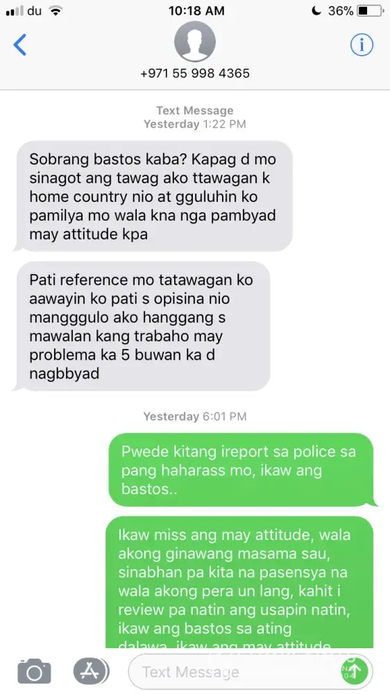 Good day, i want to complain someone working in your office, shes sending me messages saying that she will ruin my family, call my office and threatened me that she will make a scene in our office, so that i can be terminated in our company, i dont understand why shes acting like that, its so unprofessional, because i cant pay my valance, she will do like that, sending me messages using bad words, threatening me, my work, my family..