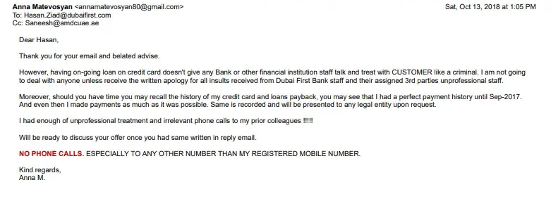 Please be informed that any further call from anyone presented from Dubai First or it's authorized 3rd party company will result in filing a police case for personal harassment with further legal actions against the person(s).