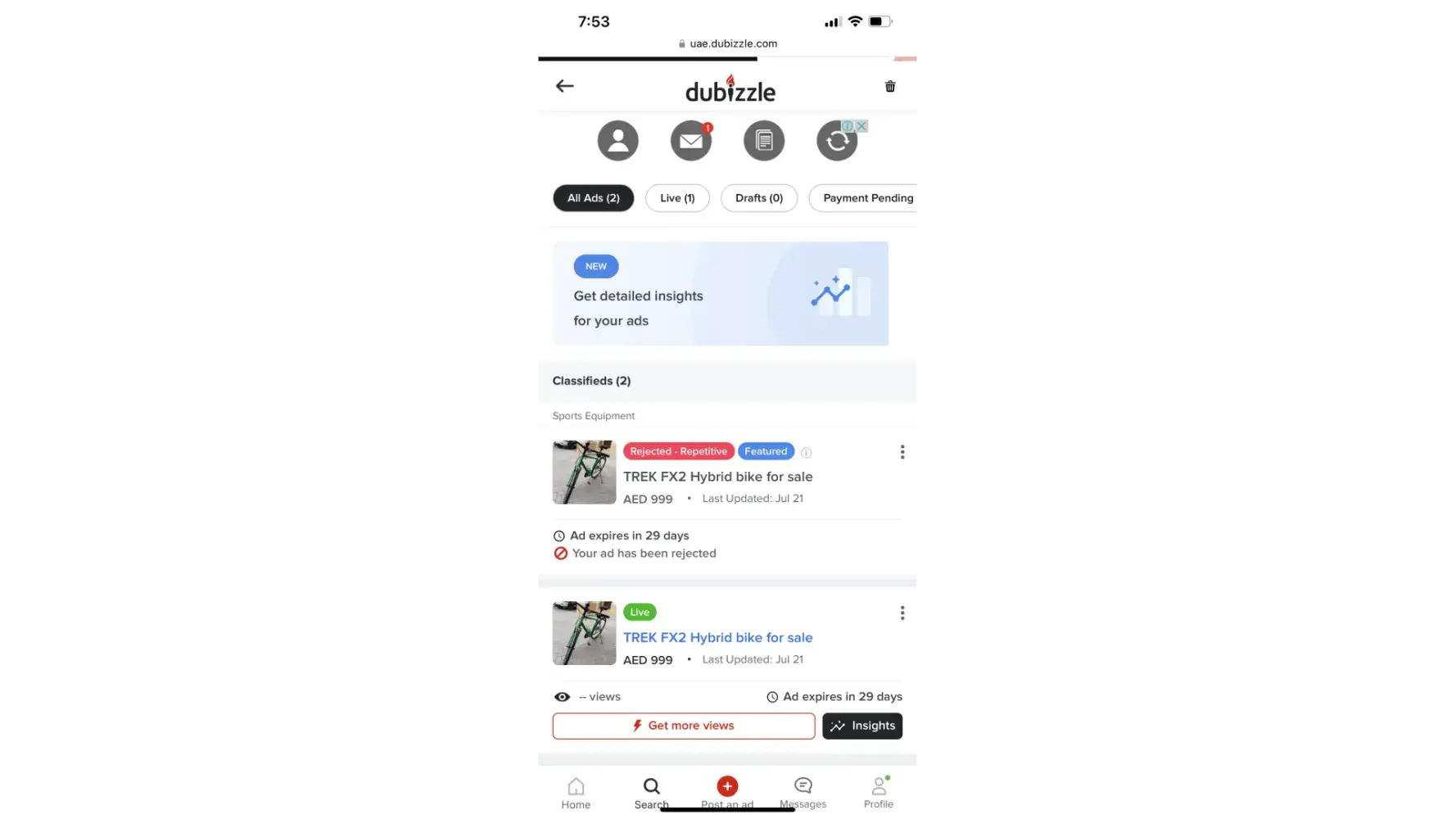 I submitted only one ad for selling my road bike and paid AED 99 for making it a featured ad.