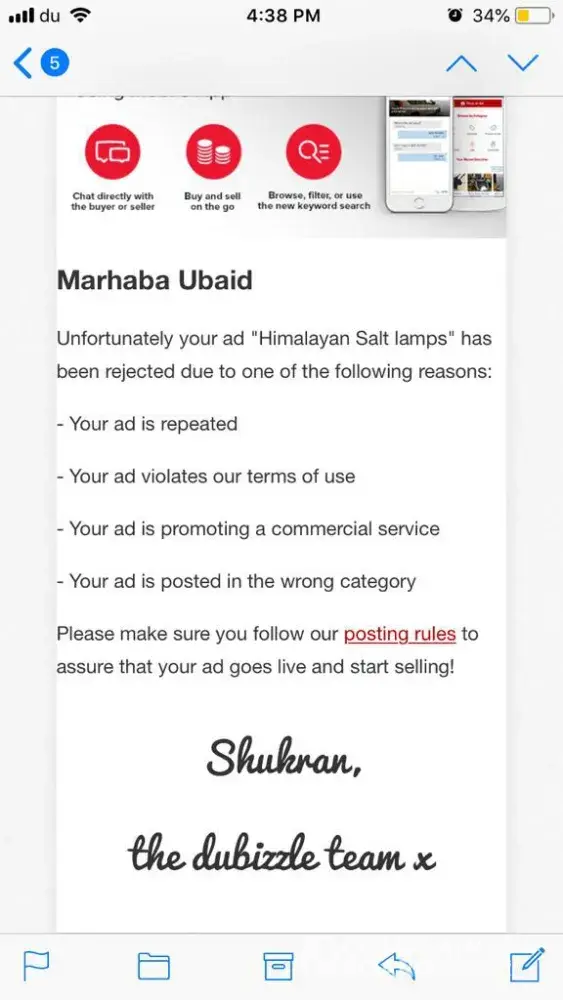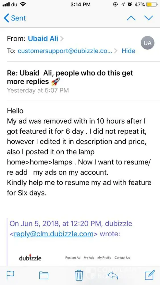 I paid dubizzle to featured my ad (same ad was there on dubizzle for almost 4 days before featuring), but when they featured my ad, within 4 hours they remove my ad and send me mail showing reasons which you can find in attached screen shot. I write mail twice on 5th/6th June 2018 for explanation but till now after 5 days passes haven't get any respond, which is truly disgusting. this behavior of you to me is not appreciated and highly condemnable. hope to hear from you soon.