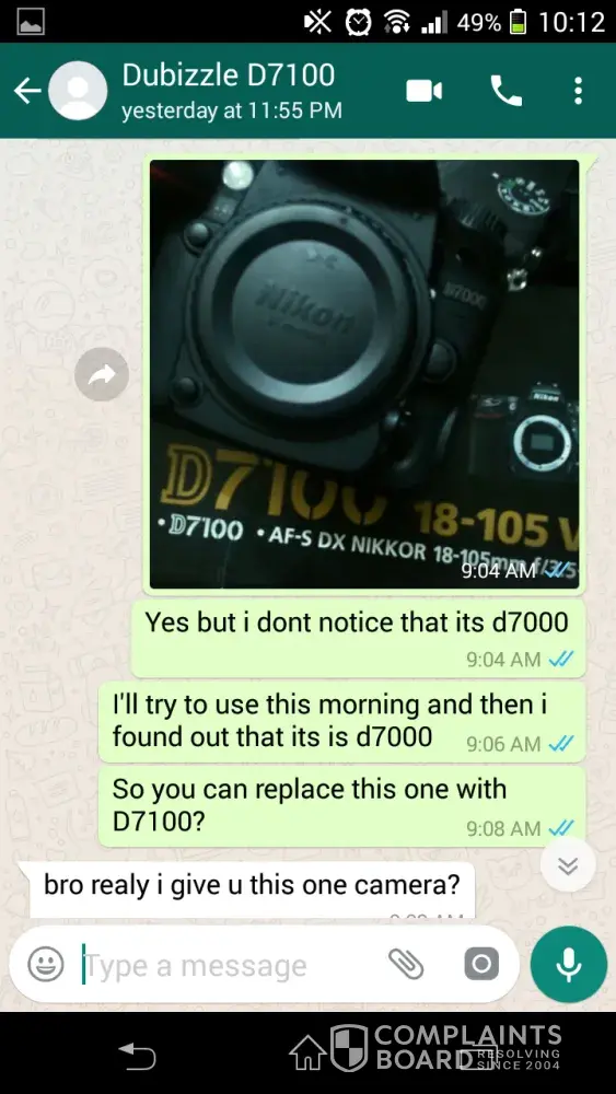 Last february 12, 2018 I made a deal to buy nikon d7100 model to this seller ([protected]), so we meet up around 7pm at palm deira metro station to complete our deal. But the following day I notice that it is different unit as we agreed by the seller. He trick me with the original box of nikon d7100 but he give me wrong model nikon d7000 which is not our deal is, I send him message and picture of unit telling that he give me the wrong model and he said maybe he made mistake because he has also another camera body, so I told him to replace the unit or return my money because this is not deal we agreed.