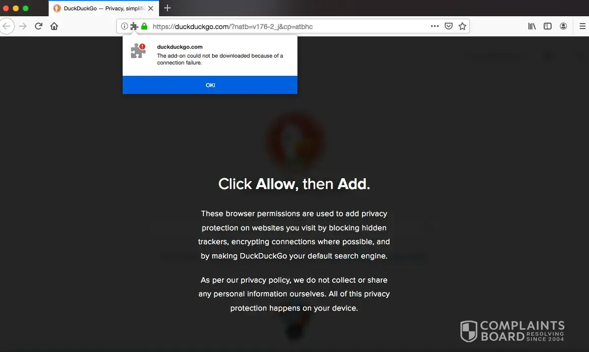 When I click to 'Add Duck Duck Go to Firefox' (screengrab attached). I get the message 'The Add-on could not be downloaded because of a connection failure' (screengrab also attached) but there is absolutely no connection failure. I have tried over and over again and adjusting Firefox preferences but am presuming this is something that Firefox have as part of their running software to prevent Duck Duck installation. Have you come across this before and if so, do you know an easy way to circumvent? Many thanks, Dan