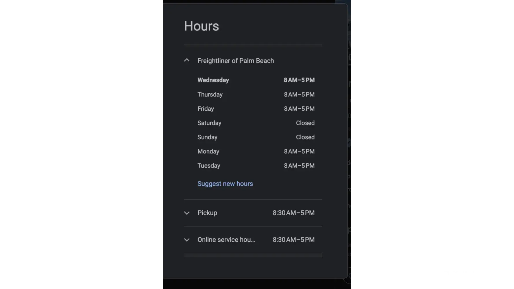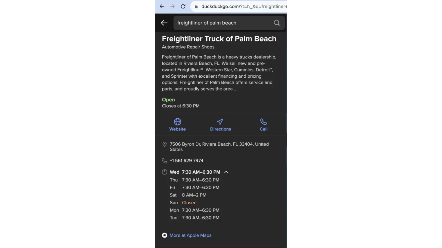 I need to change the business hours on the DuckDuckGo browser for "Freightliner of Palm Beach". They are listed incorrectly, it is shown as opening and closing hours from 7:30 AM to 6:30 PM when the CORRECT hours are 8 AM to 5 PM Monday through Friday. No one has gotten back to me about this. I need it done as soon as possible. I have called the support...