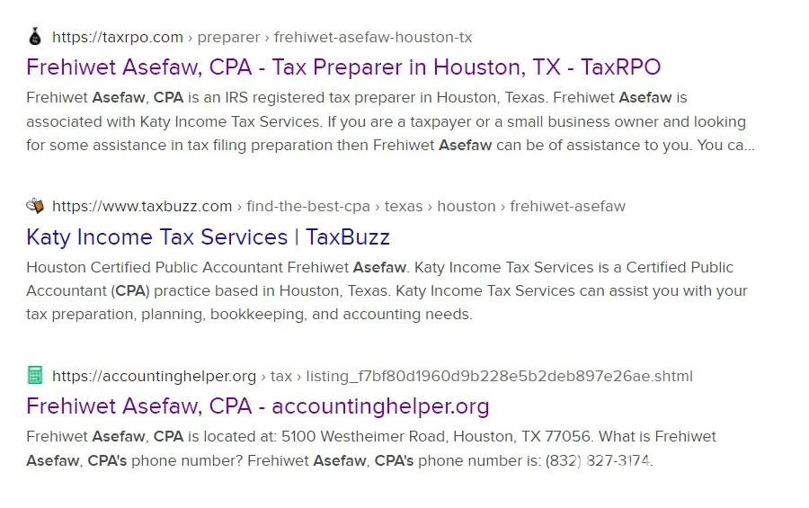 These three organizations which seem to be related are refusing to remove my data from their database. These three entities are one and the same and they are using my name to promote some other CPA and tax preparers. I am not a tax preparer. I do not have a PTIN number. I do not want to have any association with them and they are not complying with my request. I believe these organizations to be corrupt, fraudulent, and illegitimate. I want my privacy and do not want to be associated with them. Please remove my data from being pulled up on Duck duck go. I am also having problems with stalking which I have already reported to the necessary authorities. These organizations are criminal in my opinion from what I have seen. I want my name removed and want no association with these entities. I also have no association with Katy Income Tax Services and they are refusing to remove this from their website. I have nothing to do with this entity. All the information is fraudulent and it is being done to promote illegal activities. This is harmful to me and I want it removed immediately.