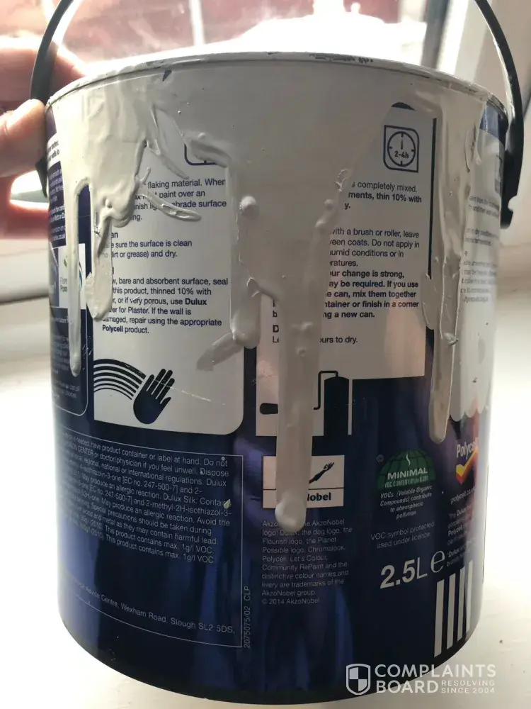I bought a 2.5 litre tin of non drip brilliant white gloss paint all my tools and equipment were clean but when I came to paint my door frames the paint had all what seems like paint skin in small pieces in it which has gone onto my door frames so I keep having to stop to pick them off I have been using Dulux for over 40 years and never had paint like this. Is there something wrong with it as its very frustrating when I know all my equipment is clean and I am trying to do a good job only to be let down by the paint.