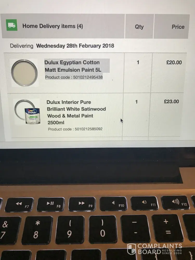 I am writing to you to complain about your Dulux Easycare range. My partner and I went into the most local Wickes store a few weeks ago and bought paint for the whole of our house as we are going through a whole refurbishment. We spent over £500 on paint and our issue that we have had today is unacceptable. Our painter was working at our house today when he started painting one of the rooms in the first out four Matt Nutmeg Whites (the batch numbers are the same) that we purchased when emptying the second pot into his bucket it was a completely different colour. Two pots were dark and two were the correct colour! We have now had to make a special trip into Exeter Wickes (a 30mile round trip) with my 5month baby at rush hour so that the painter has the correct colour for work tomorrow. This is unacceptable and so frustrating. We are now going to be out of pocket and have to pay the painter a days work extra to cover the paint that was the wrong shade and the fuel and inconvenience of having to drive to collect more paint. I feel so disappointed and really let down as this is not what you expect from a company of your size. I could understand if this was a specially made colour that we had chosen but it is one of your standard colours and this should not happen! If needed I have photos as proof. I look forward to hearing how you can resolve this. Kind regards Laura Dyer