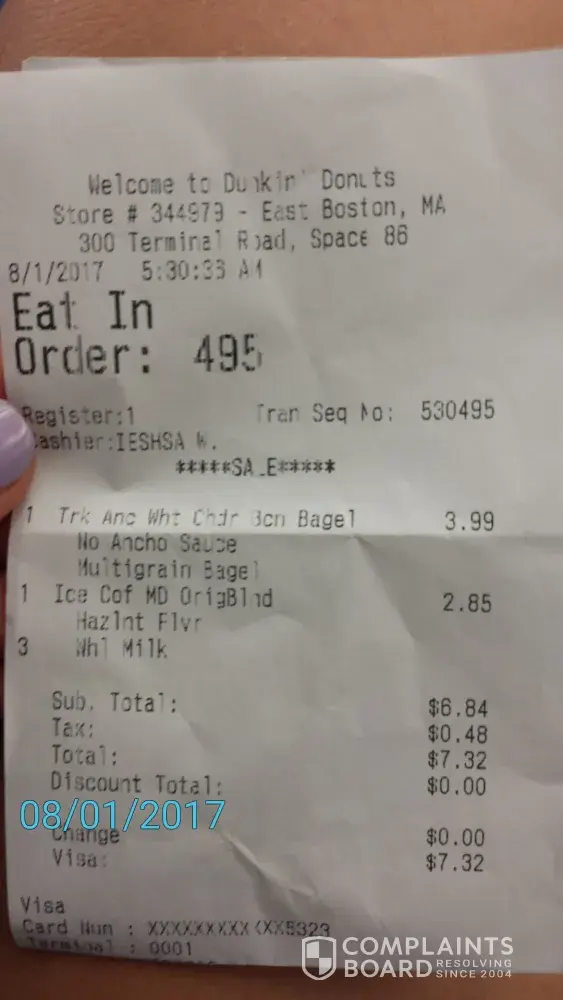 I walked this morning as usual to pick up my usual Dunkin Donuts coffee at around 6AM and really walked out very frustrated and humiliated by one of your server named Karina (receipt attached).