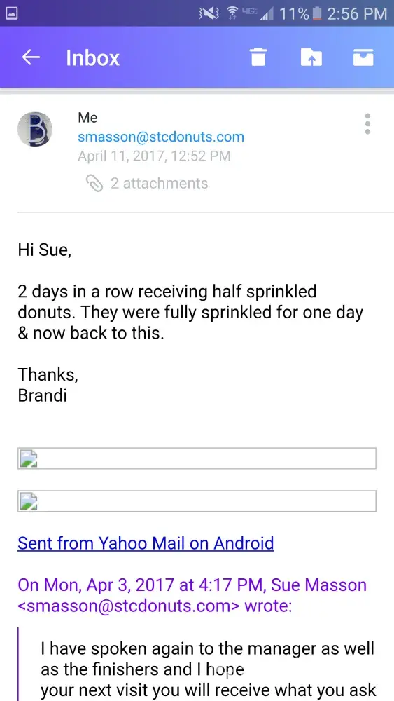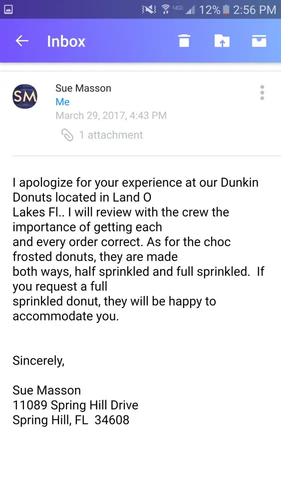 For about 4 months now, I have visited the Dunkin near me every so often. The address of the location is 16055 FL-52, Land O Lakes, FL 34638. I always get the same thing & it has only been correct a handful of times. My main issue is I order 2 chocolate frosted donuts with sprinkles. They have always been half sprinkled/partially frosted. After a long while, I became irritated that I was not getting what I pay for & that there's no quality control. Finally, I complained & was told they would contact the manager immediately & resolve this. Shortly thereafter, I received an email from a lady by the name of Sue Masson (not sure what her title is. She did not specify). She had apologized & told me, "As for the choc frosted donuts, they are made both ways, half sprinkled and full sprinkled. If you request a full sprinkled donut, they will be happy to accommodate you." However, this is not the case cause I request a fully sprinkled donut every time & I'm always told they do not offer fully sprinkled. I told her I appreciated her response & looked forward to getting what I pay for. I visited this location a couple days after our conversation & nothing had changed. I still recieved half sprinkled. I spoke with Sue again directly & she told me she would handle it. My next visit, I had finally received a fully sprinkled & fully frosted donut! Then, the next visit after that & the 4 following visits, I began receiving half sprinkled donuts again! Every single time, about 4 or 5 times total, I messaged Sue directly & emailed the customer service department via the Dunkin Donuts website. Every time, I recieved the same reply stating it would be resolved & they apologized. It has been almost a month & a half & this issue has yet to be rectified. I am so fed up with all of this & this will be the last time I reach out to Dunkin regarding this issue. I hope this will be taken care of. I plan to visit this location one last time in hopes I will recieve what I pay for. If I still recieve a half sprinkled donut, that will unfortunately be my last visit. I was told Dunkin has a high standard for customer satisfaction but that is clearly not the case. I have been patient & persistent long enough. I hope this gets resolved asap.