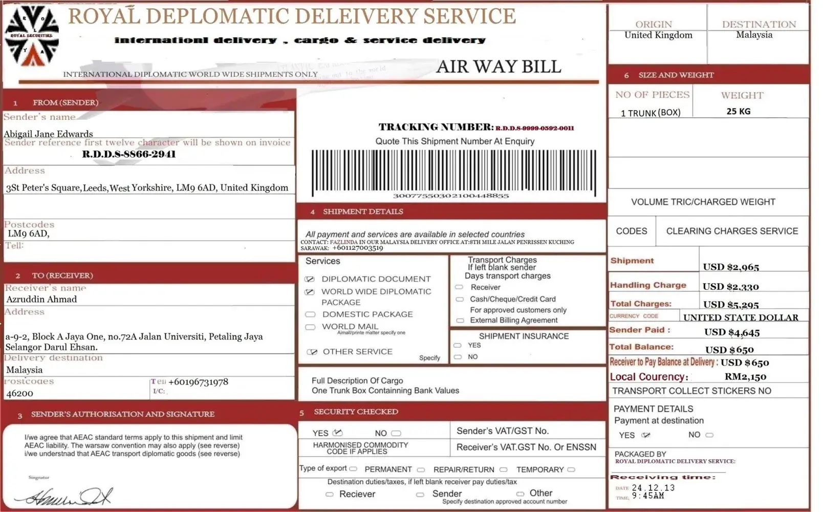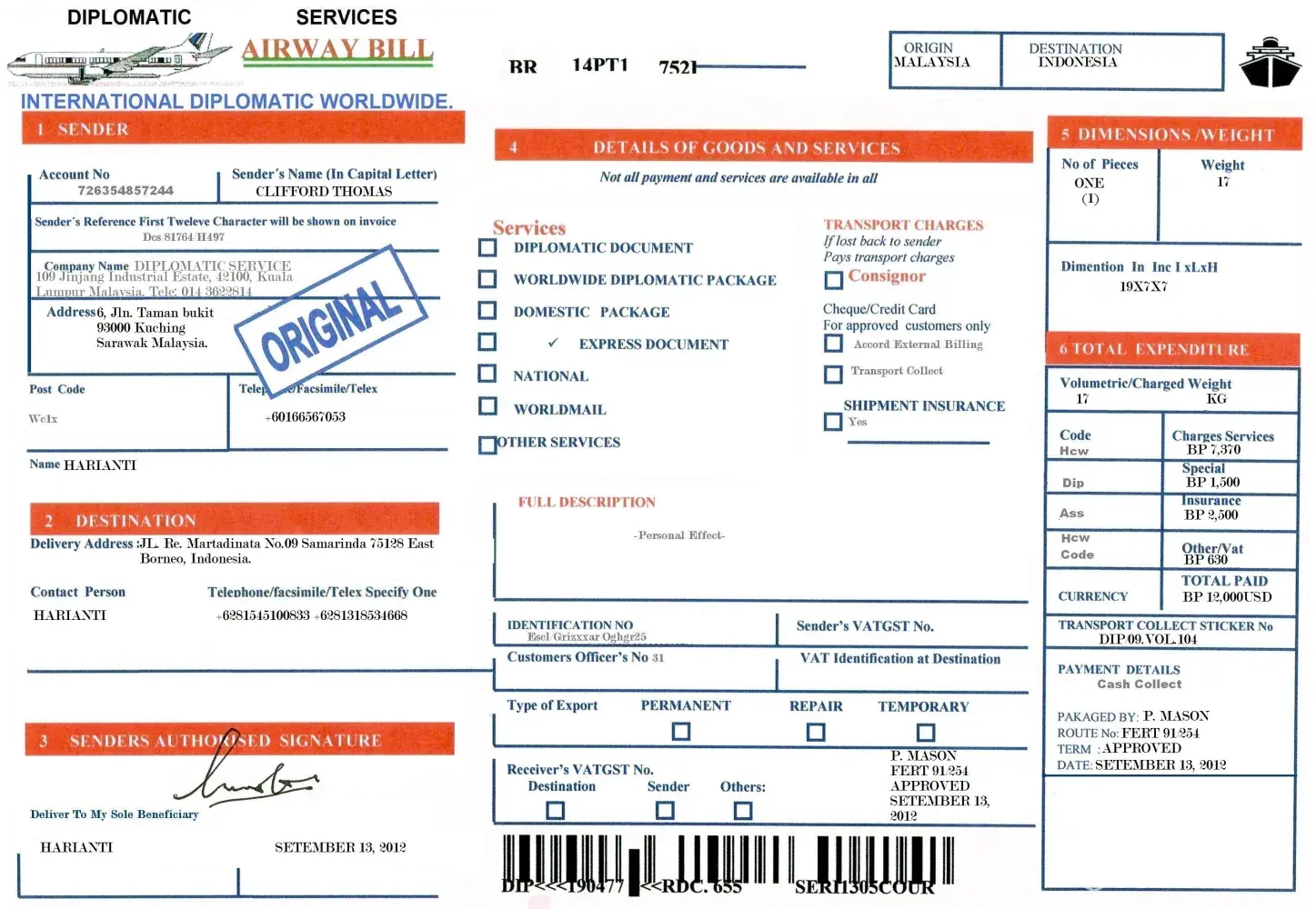 he use diplomatic service to send the money from Kuching Malaysia to Indonesia. Then when the money was arrived in Jakarta, the staff of diplomatic said i must send the money USD 4.200. So the luggage can they take from the airport.
