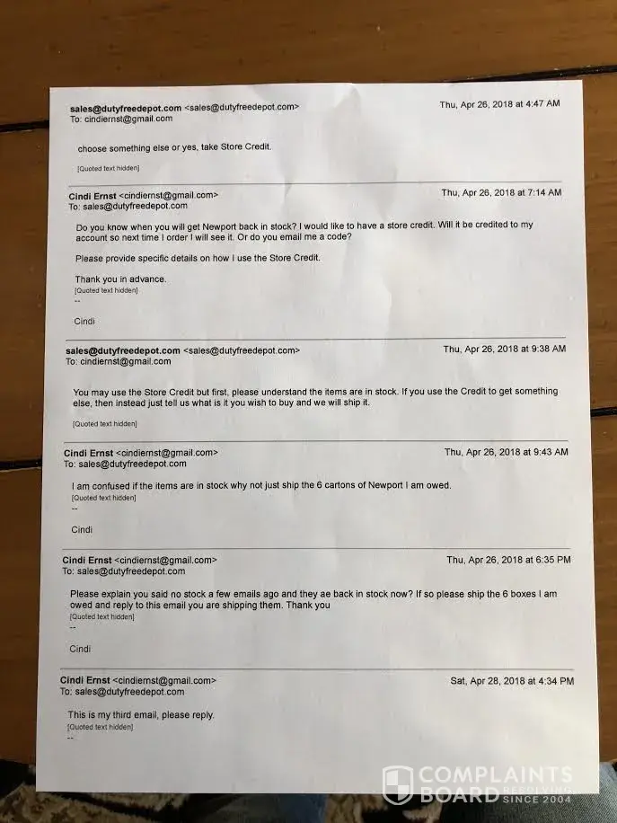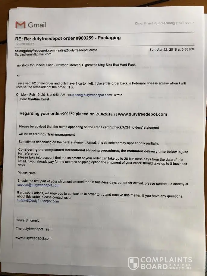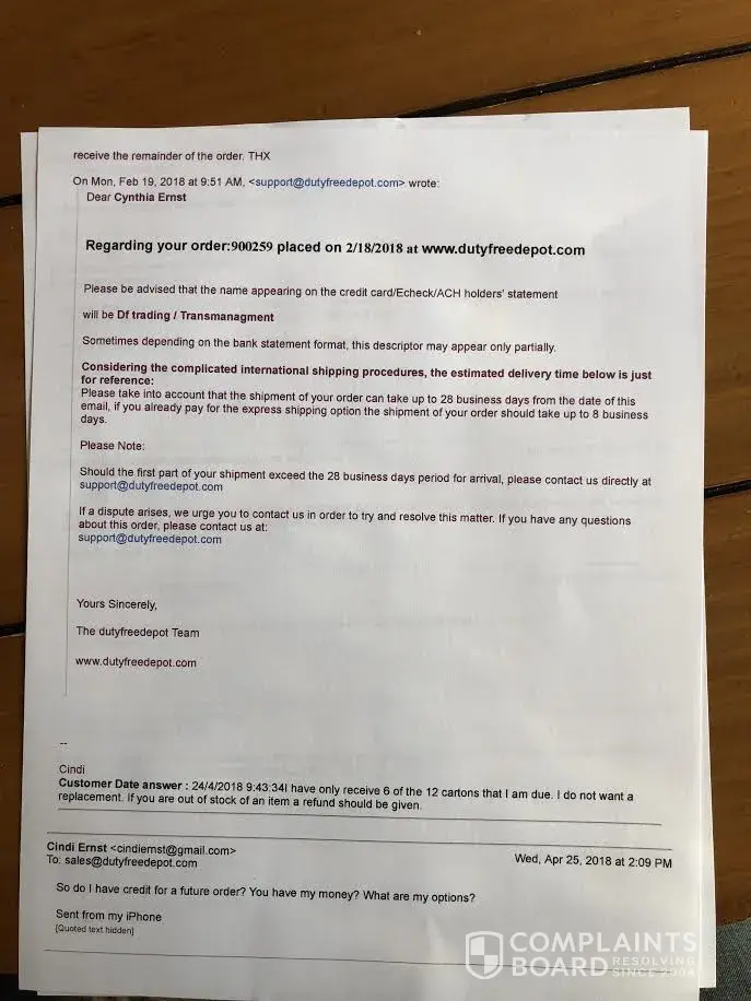 Our conclusion: ComplaintsBoard's review suggests Duty Free Depot is generally legitimate and safe for transactions. However, with a resolved complaints rating of 29% we recommend that you stay careful. Before interacting with Duty Free Depot, take the time to review customer feedback and the approach to resolving complaints.
