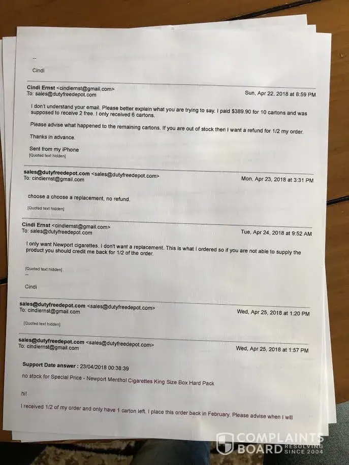 I order from DutyFreeDepot on July 2019. After several shippings I did only get my order partially on Dec 2019. And I decided to cancel my order and request a refund by Feb 2020 . I was shocked when I saw the refund was less than expected even when I proved with picture and evidence that I received less product than they thought. It's completely unbelievable lack of ethic what DutyFreeDepot is doing