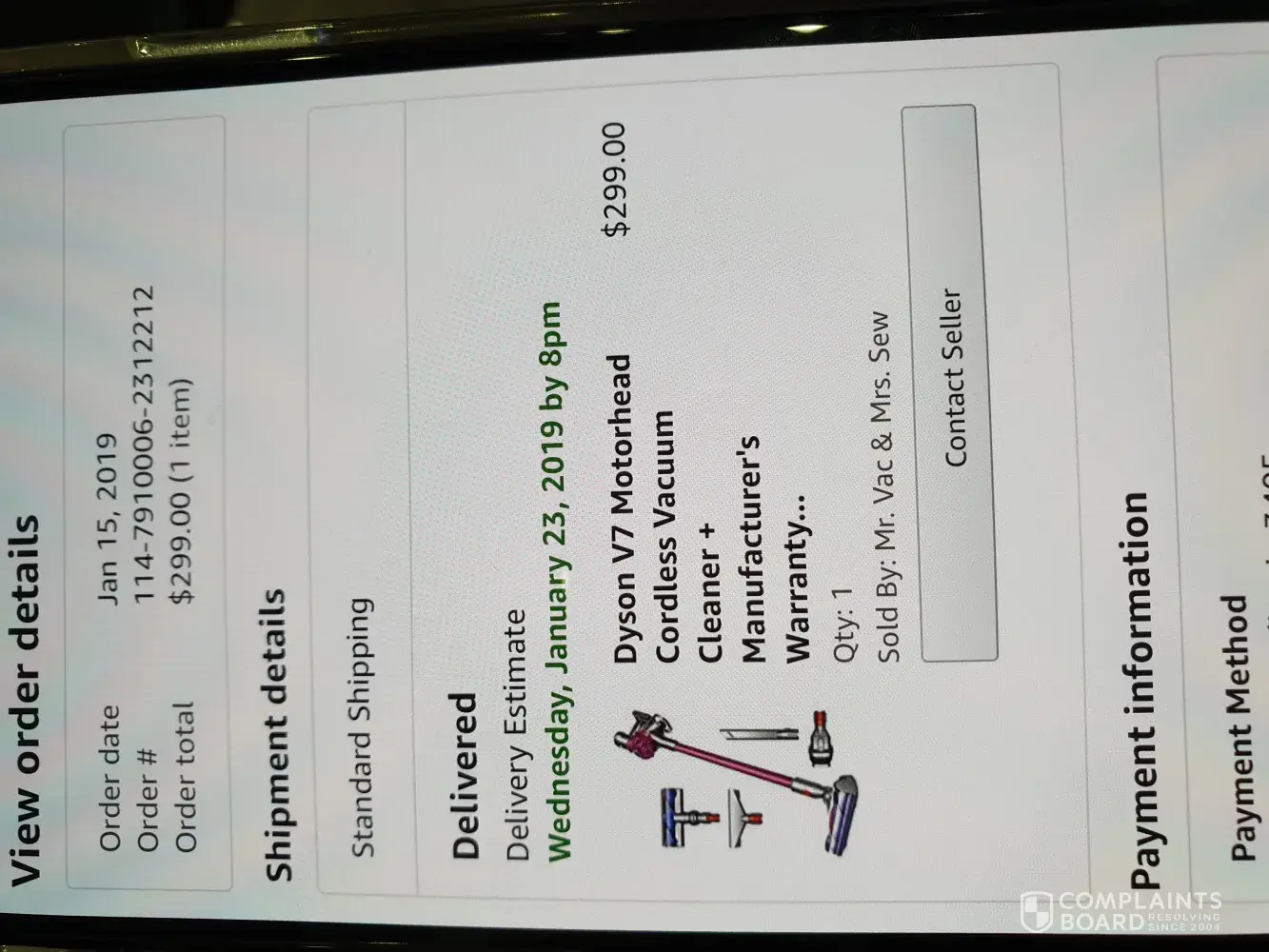 I am complaining about dyson vacuum which I have ordered