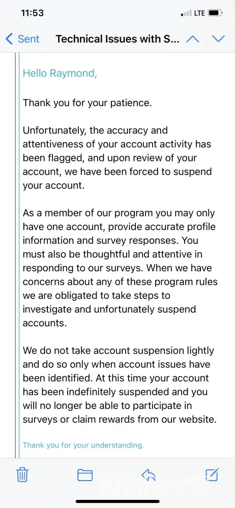 We do not take account suspension lightly and do so only when account issues have been identified. At this time your account has been indefinitely suspended and you will no longer be able to participate in surveys or claim rewards from our website."