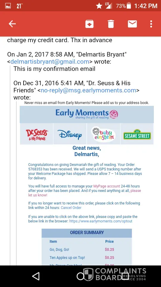 I'm writing on behalf of Early Moments, as we absolutely want you to have a positive experience with your book subscription. It seems there was a misunderstanding regarding your order. Though some time has passed, we'd be happy to do anything we can to improve your experience, we will just need your account info to do so - would you please email me directly at jamie@earlymoments.com with your email address?