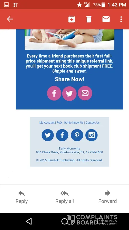 I'm writing on behalf of Early Moments, as we absolutely want you to have a positive experience with your book subscription. We're sorry we're just seeing this message now but you posted here on a third party site, not on our page, so we were not alerted to your post. We'd be happy to do anything we can to improve your experience, we will just need your account info to do so - would you please email me directly at jamie@earlymoments.com with your email address?