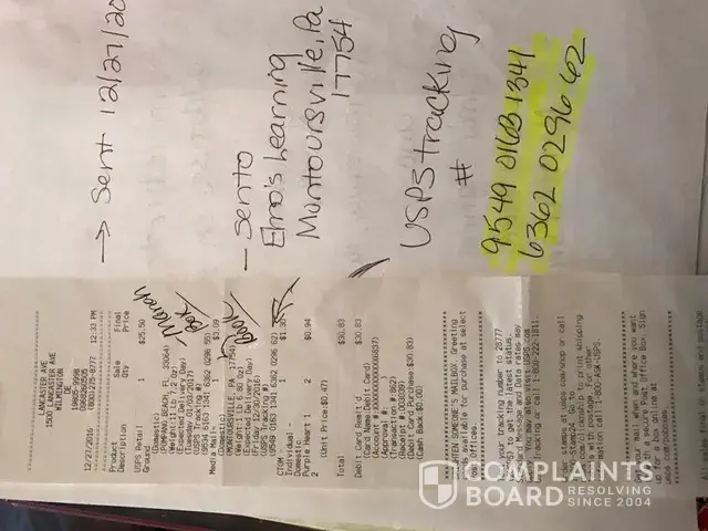 12/27/2016 @ 12:33 p.m. - I went to the United States Postal Office and returned the merchandise.