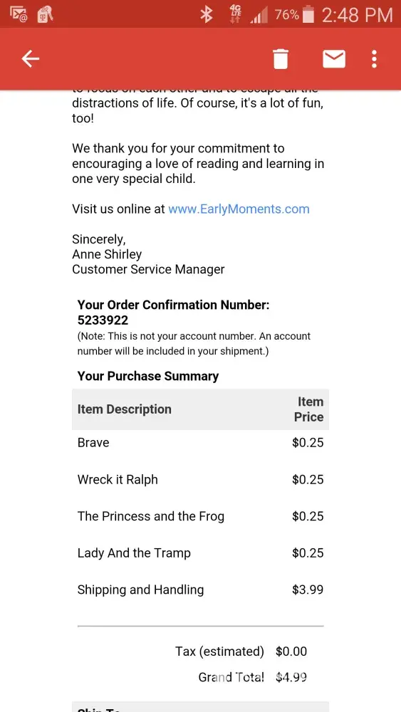 Wow! Early Moments needs put out of business. Their customer service is awful! I'm currently dealing with an issue with them. I ordered the initial package for $4.99 +tax and received my items in the mail. Then it was only 5 days later and they had taken $20.xx out of my checking account for the next shipment of books! They didn't even give me a chance to call and cancel. That's not even the half of it! When they did take out the $20.xx amount, it overdrew my checking account and it cost me over $50 in overdraft fees and now they won't refund me. I even sent back all the books! I write to their "customer care" everyday and will continue until I get my money back! Horrible Horrible Horrible!