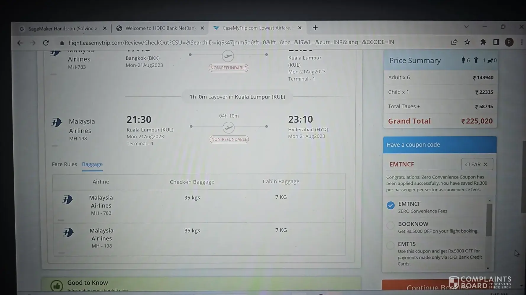 EasemyTrip-plainly dishonest to advertise a 35 kg baggage allowance when, after you've paid, it will drop to zero with no way to choose the appropriate baggage option.Due to the terrible site design, I lost 50000 /-