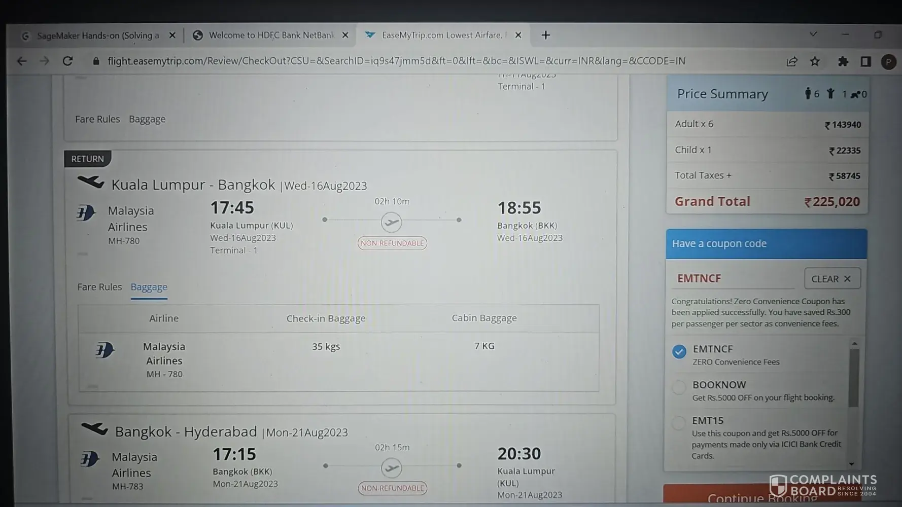 As per the attached screen shots from the Airlines, it's clear that I suppose to get a free baggage allowance of 35 kg for each person. After paying the full amount it is showing zero baggage. In between airlines never shown that my baggage reduced to zero or price has dropped or increased w.r.t first page.