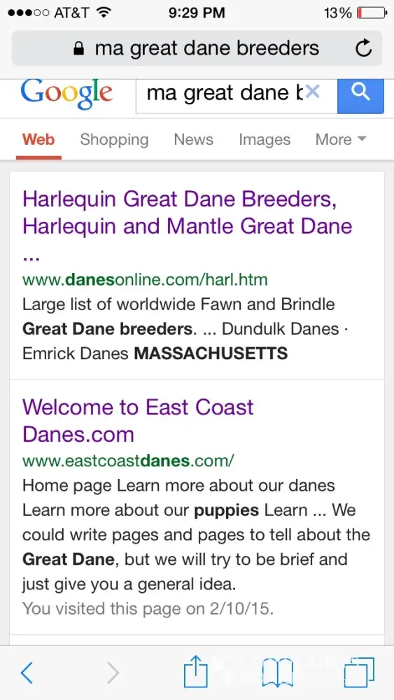 I just wanted to post these two photos, showing that it is true. One is a Google search for MA Great Dane breeder-under which Lori Palmers East Coast Danes comes up #2 and the second is HER OWN POSTING from 2012 stating that she had just moved to SC and that she would need a dog sitter several times a year. She is lying about where she lives and breeds her dogs. To what end I couldn't tell you. But if she is lying about that what else is she lying about. I'm so glad I didn't get a dog from her.