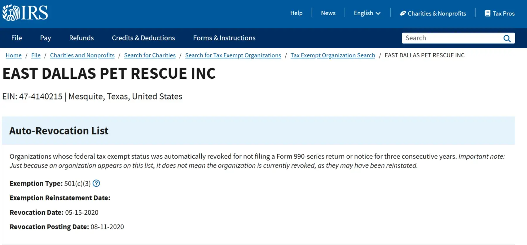 Given the misleading information, unprofessional conduct, and potential falsification of records, I am requesting a full refund and for the organization to take the dog back. Furthermore, I have discovered that East Dallas Pet Rescue is on the IRS Auto-Revocation List, raising additional concerns about the organization's legitimacy.