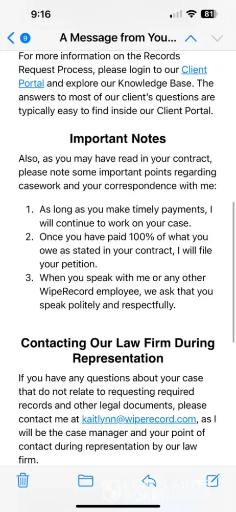 Therefore, I also know with the nature of my case which was started with this firm in October, 2022, there is ZERO reason and ZERO chance that under any circumstance other than COVID (which we are long past where that could be the cause), that it would take this long to process expungement of 1 conviction in my area. This firm is also aware of how many times I have attempted to contact them through multiple mediums.