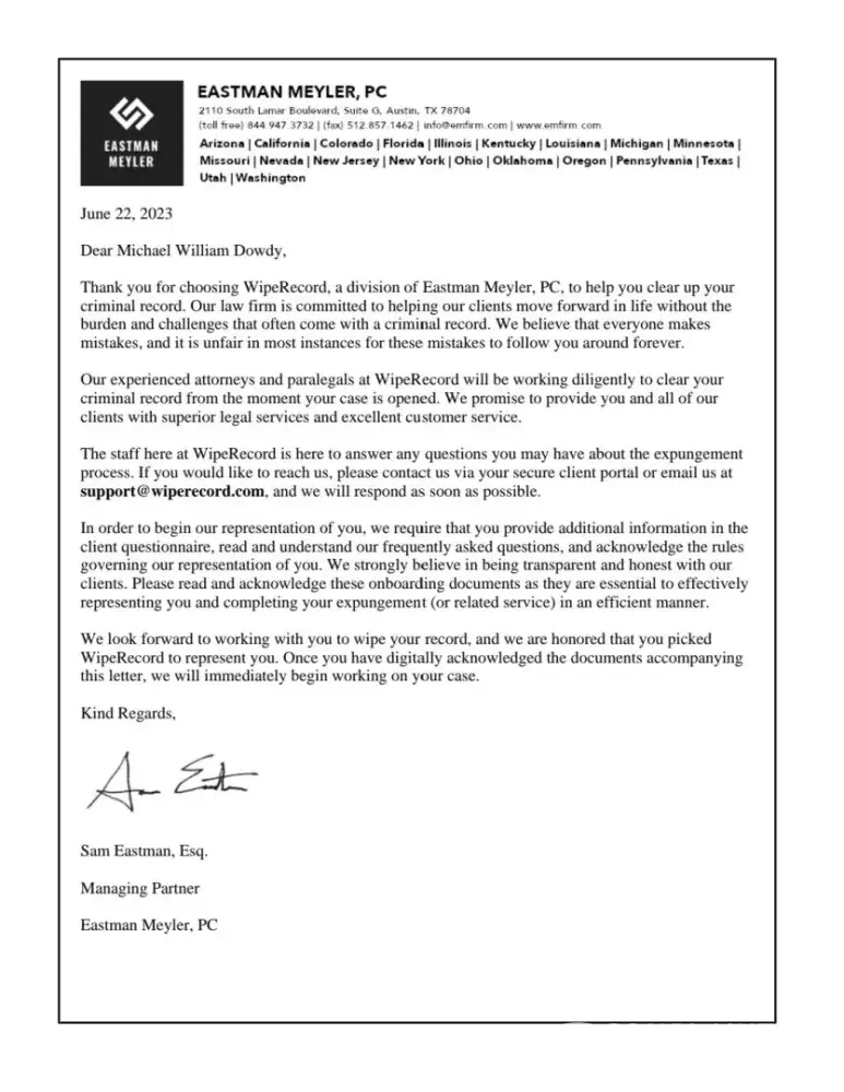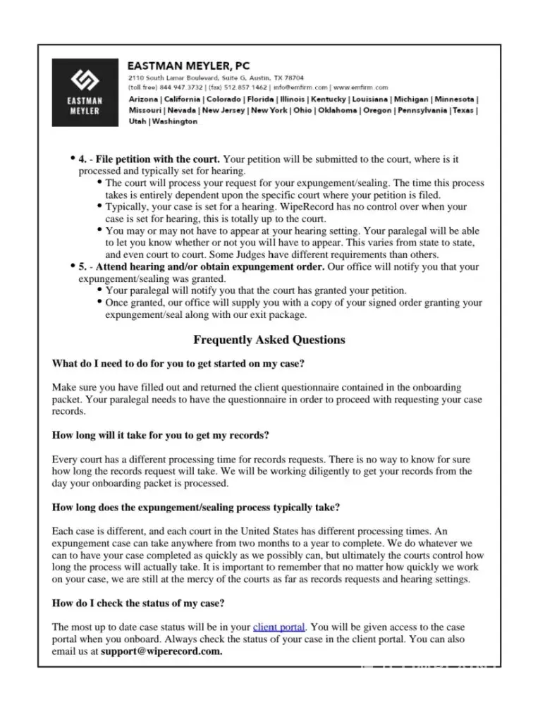 Eastman Meyler PC did a very good job in getting my criminal record sealed and assigned a very good paralegal Named Daniel B to my case I would definitely recommend using this company if your serious about clearing your record or regaining rights