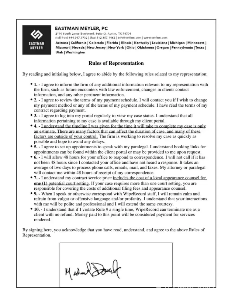 I contacted this law firm (Wipe Record) which is In C/O Eastman Meyler. They are apparently supposed be very good at helping people regain their rights and expungements and such. Well I have paid these people and still have not seen any results. There have been no court dates on my behalf , no calls to me or anyone for that matter. At one point I was told by an "employee" that the person(Christina) working on my case was no longer there and she hadn't filed ANYTHING with the courts. So I need one of 2 things to happen either refund me my money or finish my case. Better yet I just need my money back at this point.