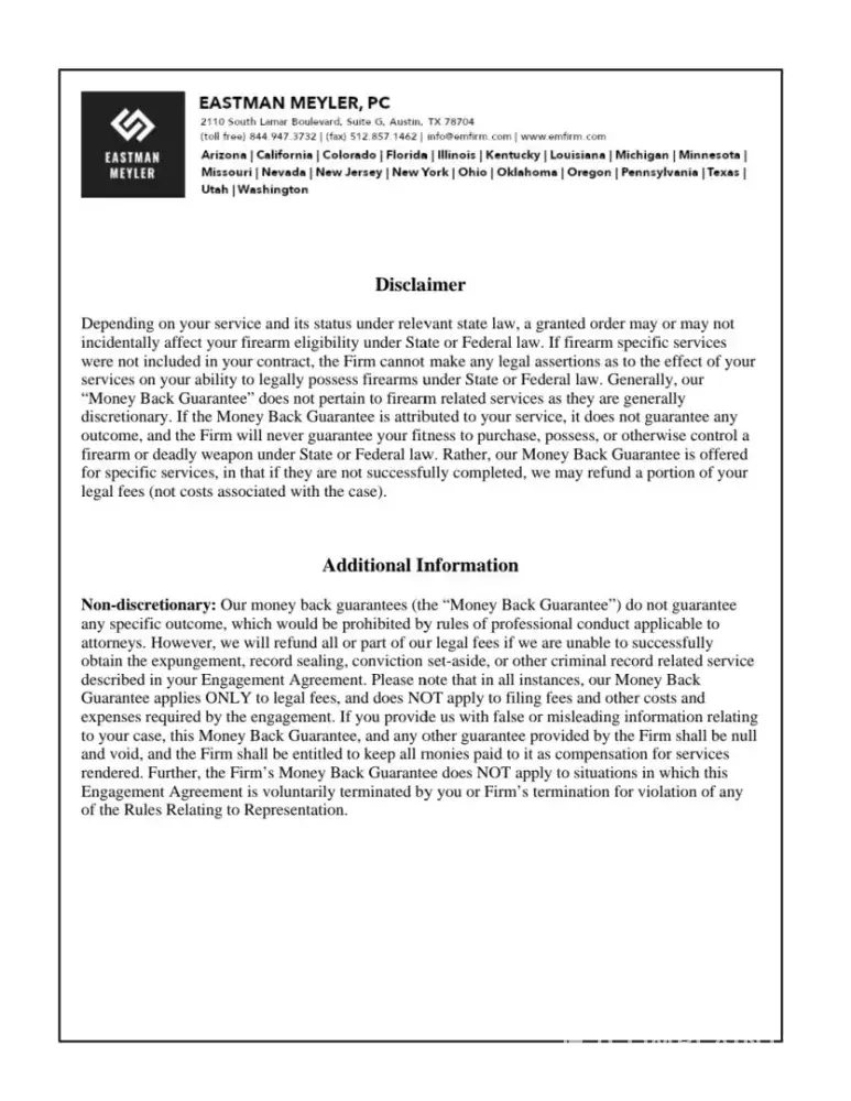 I needed to clear a few things off of my criminal record in order to accomplish two things, get a job, and get a gun. Well, it took some time, and it wasn't free (nothing worth it ever is) - but the team at Eastman Meyler guided me through the process and helped me accomplish both of the goals I was looking to achieve. I have a job that I wasn't able to get in the past due to background checks always flagging me (I'm drive a fedex route now and have amazing benefits + salary), and I was able to legally purchase a firearm so I can go hunting with my kids without the worry of getting in trouble. Thank you specifically to Max for really holding my hand through the entire process. Would recommend. Very professional and they do what they say they will.