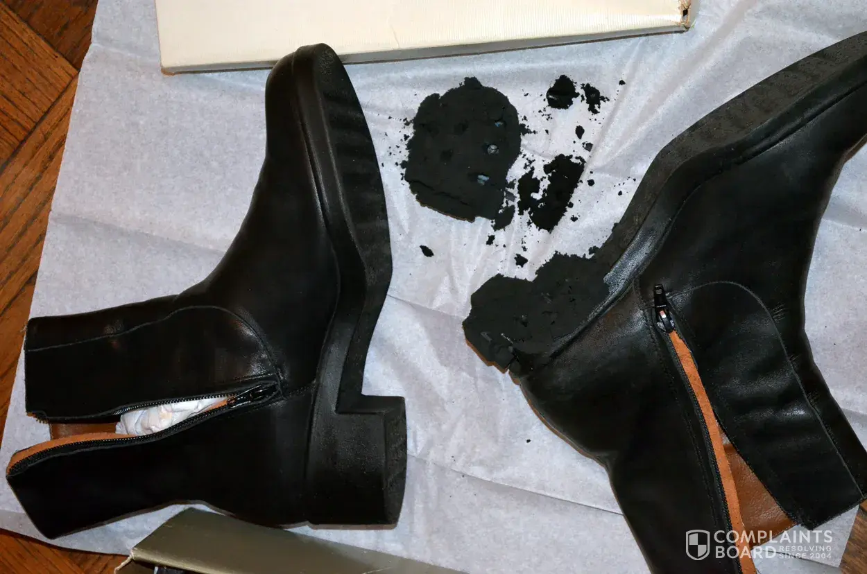 I have just had the same experience iwth a pair that I wore twice. I discovered that a chunk had come out of the right heel after wearing them to church. Walking to and from the car parked near the church and inside the church and parish hall. Then on Christmas Day put them on inside to wear around the house. This time when I took them off I discovered the left heel was deteriorating and the sole cracked clear through. The right sole was starting to crack as well. I am going to throw them away but wanted to see if my experience was unique.
