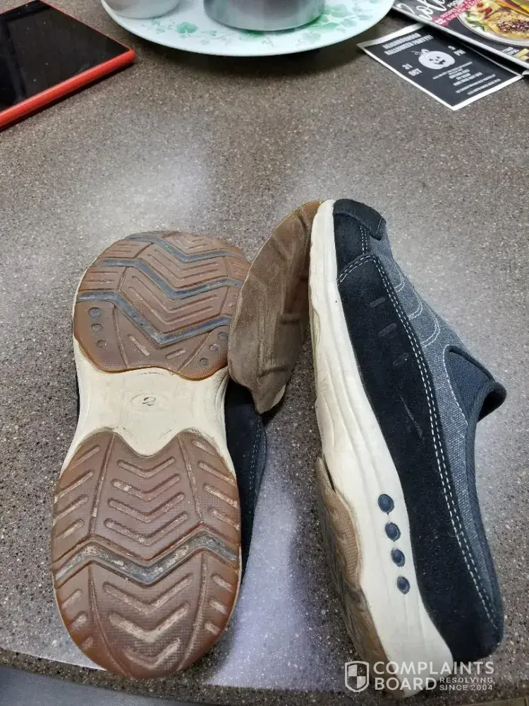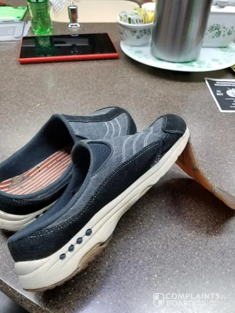 I have had many pairs of Easyspirit shoes and have never had this problem before. A portion of the shoe is peeling off and looks bad. They were made in China. I am attaching a picture. How do I complain to the company?