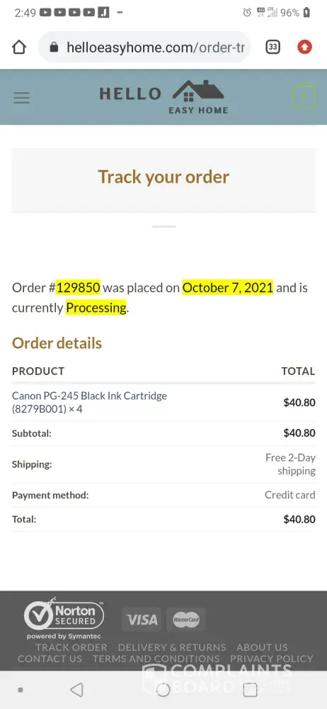 October 7th 2021 I place an order for four Canon ink cartridges. The order still shows processing it's already been paid for and payment has been received. When I tried to contact them by email it was returned saying email undeliverable.