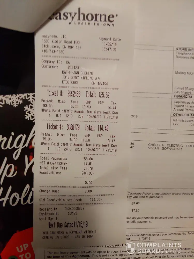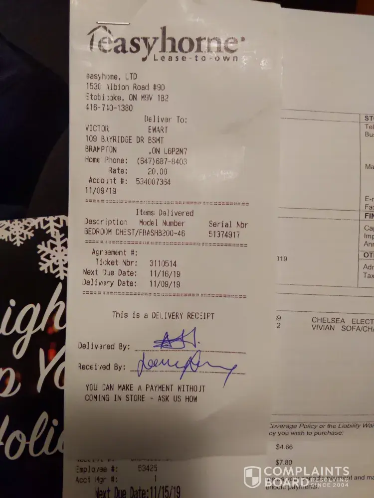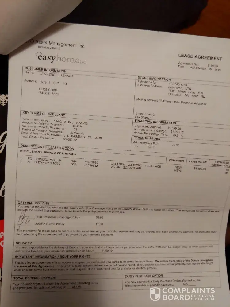 Easyhome must be peddling goods from person to person- nothing I get works well, and the interest rate has my jaw clenched. I went with them in the first place hoping that it would help me rebuild my credit a bit, but I keep having issues with payments. I have the money but they don't have the file in order. Also it doesn't seem like they took what I paid into the laptop and applied it to the washer and dryer, and now I'm paying 2k+ for a Moffat washer that doesn't work, and they are giving us the run around about sending someone to repair it. Seriously ready to take them to small claims court. Bloody scammers with a business license.