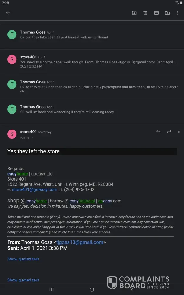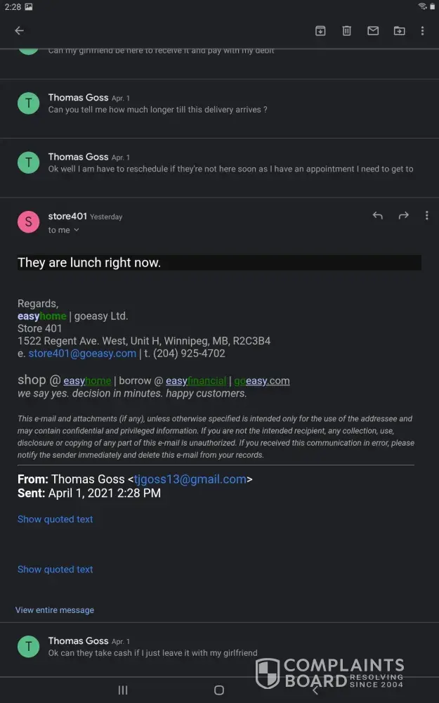 Hi im filing a complaint on go easy in red deer. I will be going to BBB as well. Mihajlo had gotten 1 day off from work on sunday. He had gotten kids some school supplies on SUNDAY WHICH GO EASY IS CLOSED. Yes we are behind and we are very sorry. But to have the red deer staff start messaging saying they seen him on sunday at dollarama, i feel like there stalking us and what happens on there time off and Mihajlos is privacy which should be respected by both parties... Someone needs to explain to these ppl that oilfield is nothing like there mon-fri jobs. They are on call 24/7 and work all hours of the night and another crew days. The company is cheap and makes them get a hotel because paying a supervisor to travel back and fourth to home and work cost them lots of money and time, and kilometers. WE DO NOT APPRECIATE THE TEXTS SAYING THEY SEEN HIM ON A DAY GO EASY WERE CLOSED THE FOLLOWING DAY THEY OPEN. AGAIN THREATENED LOCKSMITH AS WELL TO ENTER MY HOUSE. BBB WILL BE CONTACTED if nothing is done this time.