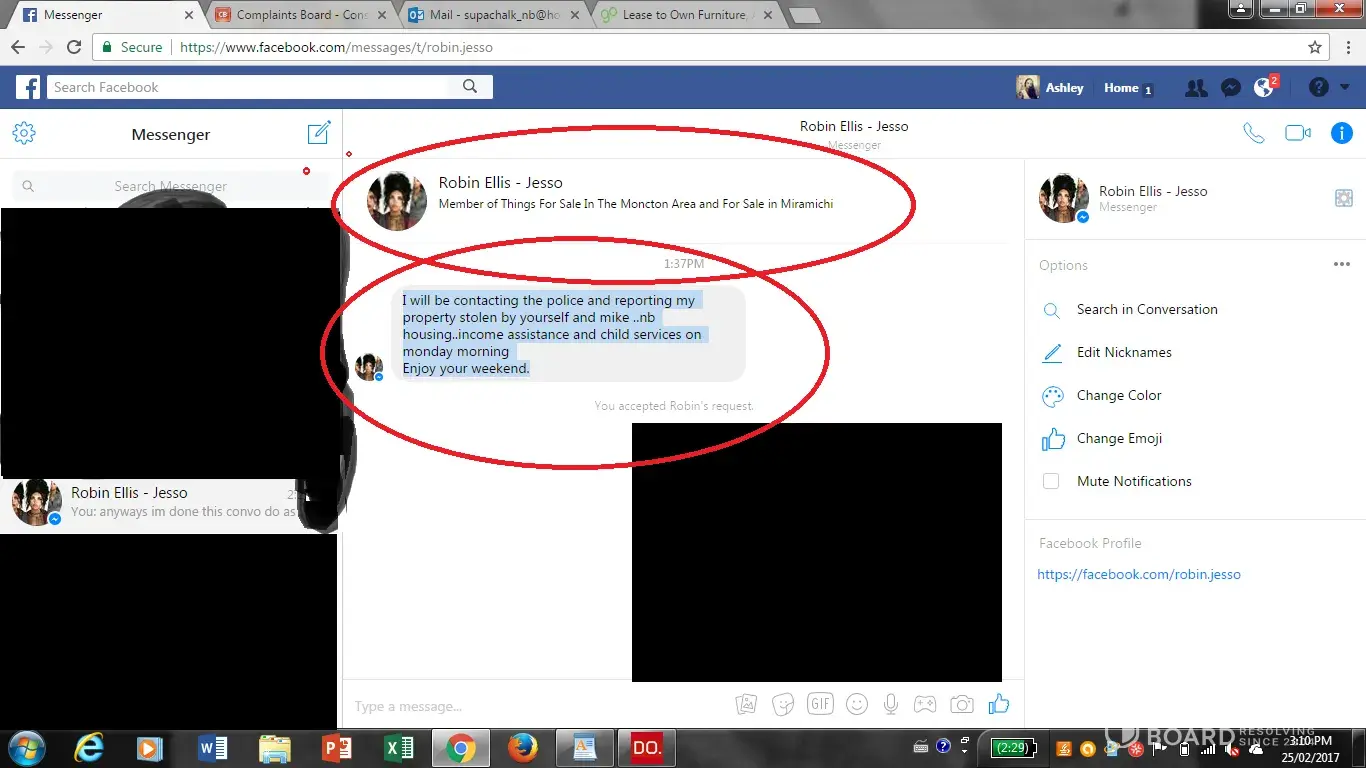 To whom this may concern, I have recently had a very unpleasant experience with your Miramichi accounts manager Robin Ellis-Jesso. She has threatend me via facebook over an unpayed account of mine that i have with them, yes they have tried to contact me but i was not home at the times of the calls or house visits, I am a mother of 5 young children and there fore i have appointments and places to be on multiple occasions.. Today Saturday Febuary 25th 2017 Easy Home from miramichi went to my place of residence and banged on my door for almost 3 hours blocked my driveway and harrased my company.. I was not home at the time of their visit my boyfriend was and he is not involved with easy home what so ever his name is not on the account and his address is not at my home because he lives with his parents not with me. After about 3 hours i received a nast message from Robin via facebook threatening to call cops social services and nb housing monday morning to get her stuff back, I really dont appreciate these kinds of threats and dont think they are very professional from her part to be honest, judging ones parenting because of a few missed payments with easy home is not very professional... I then went on to message her on facebook and explained to her my situation pregnancy complications in December etc etc and offered to then work out a payment for March 20th 2017 and she refused, and choose to be snobby with me and continue to judge me and my parenting skills.. I have saved all the msgs between Robin and I incase of furture issues.. After all the arguing via facebook I then still offered to pay them March 20th and she refused once again. I explained to her my situation and y i was so behind etc etc but that didnt matter to her she refused to listen and continued to be non understanding and called me a thief I told her I was not a thief that i hadnt went into the store and stolen the furniture that they had delivered it to my place of residence there was a difference she blew that way out of proportion... anyways like i said before I am still willing to make a payment on march 20th 2017... And for the future I think Mrs.Robin should think before acting especially when it comes to threatening clients I am seriously thinking about contacting the police myself.. Feel free to email me back anytime...Also I have enclosed a snapped picture of the message she sent me today down below... I just blocked out my other contacts for their own privacy thank you your's truly Ashley Brun