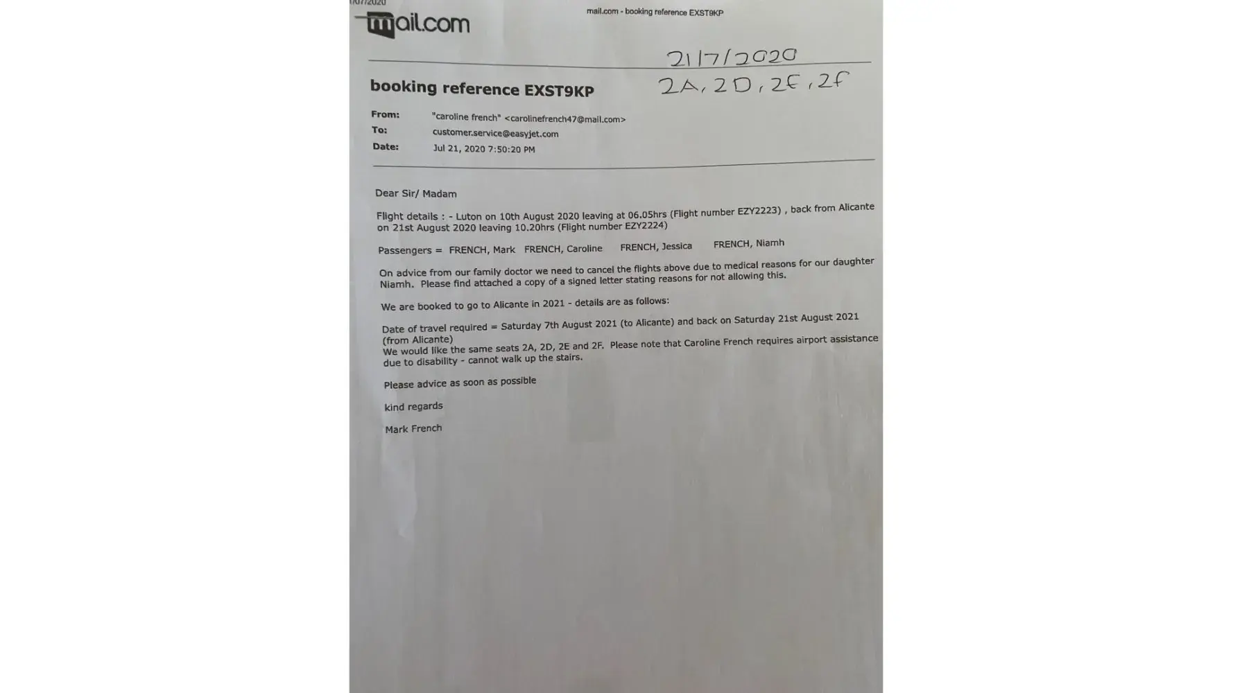 21-07-2020 email = email from C French to Easyjet stating we wanted the same seats