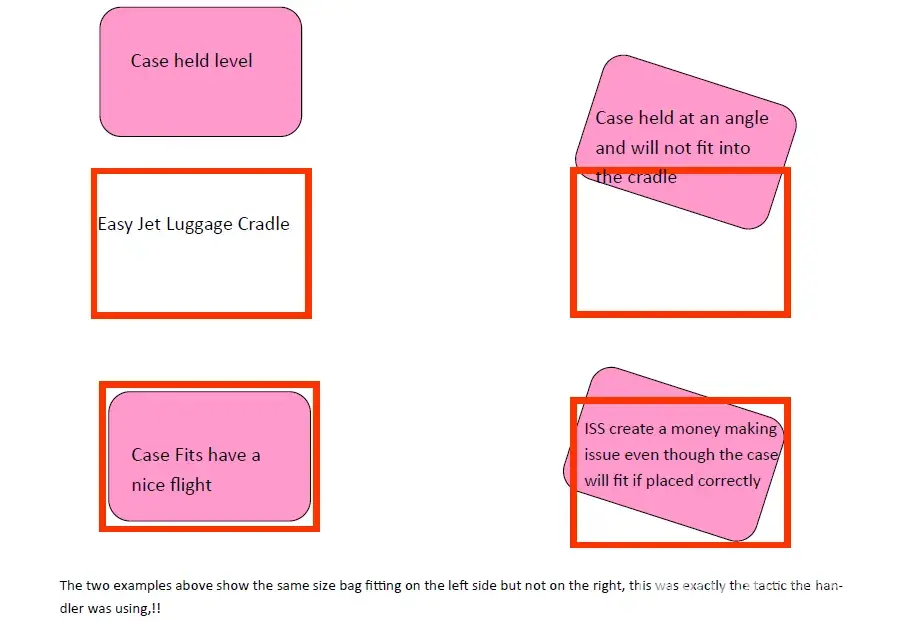 My wife was told her luggage did not fit your requirements; I explained that the cradle must be smaller as it had fitted in London and I had been careful to measure the case, from your printed T&C, before we left home. He dismissed this and said it was oversized and thus we would not be flying! I asked him to show me that the case did not fit, he refused stating it was his decision and we had to pay 50 Euros or stay in Vienna. Knowing that our case was in fact the correct size, my wife went to insert the case into the cradle to show the ISS man it fitted, he grabbed her arm tilted the case at almost a 45 degree angle and shouted see it does not fit.