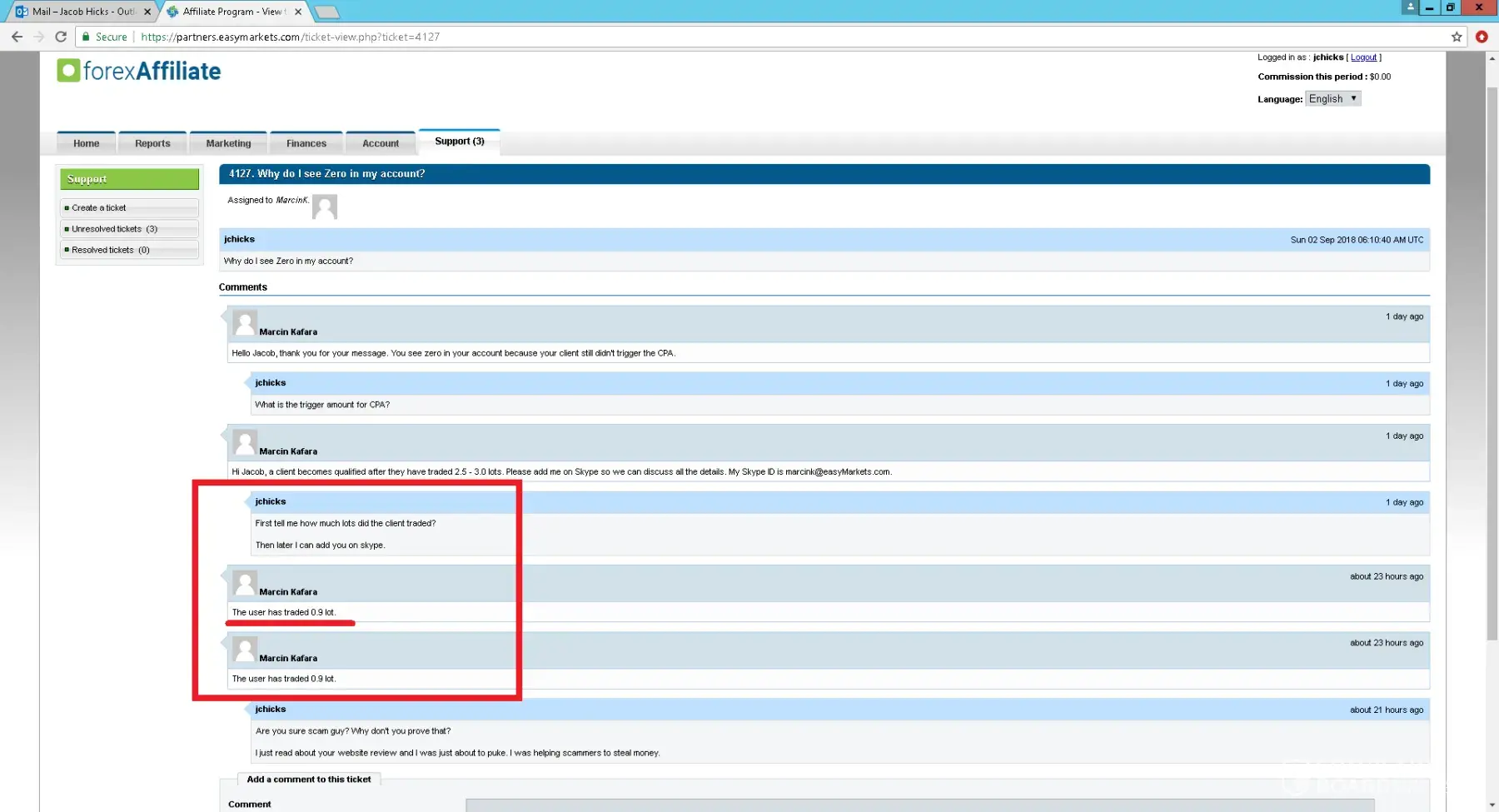 By the first week of payment month, I checked my affiliate account and got shocked because there were $0 earnings which suppose to be $400. Then I asked affiliate manager called "Marcin Kafara" and he said that the client has traded only 0.9 lots which I seriously doubt because even previous month he said the same.