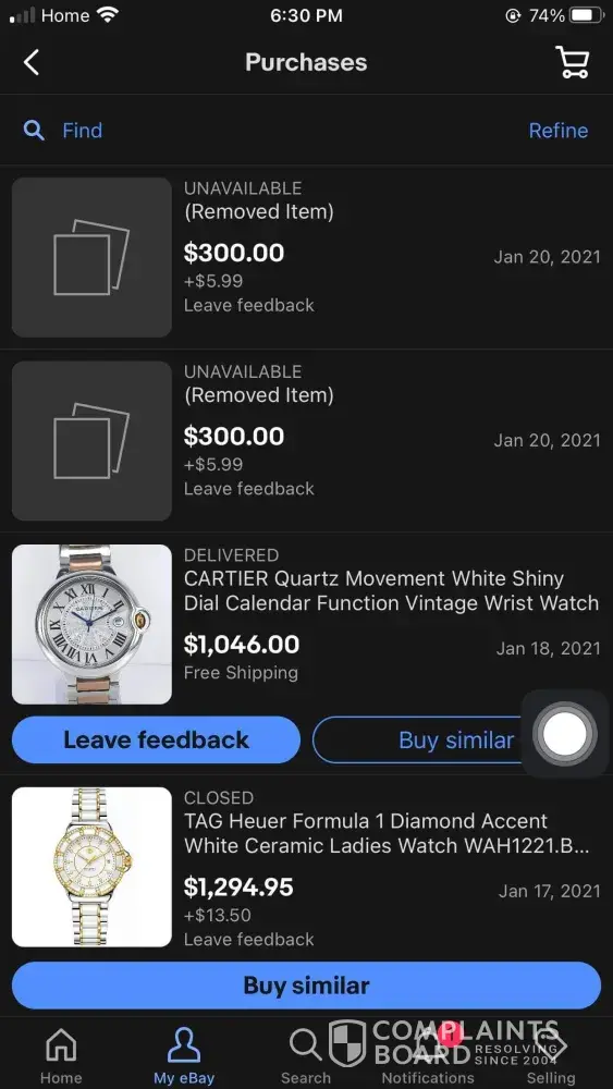 On January/ 18/2021 > I purchased a Cartier watch with amount $1127.07 (over a thousand dollars) but I foud out a watch is fake replica Cartier watch