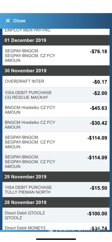 5 different amounts of money taken from my visa befit card
