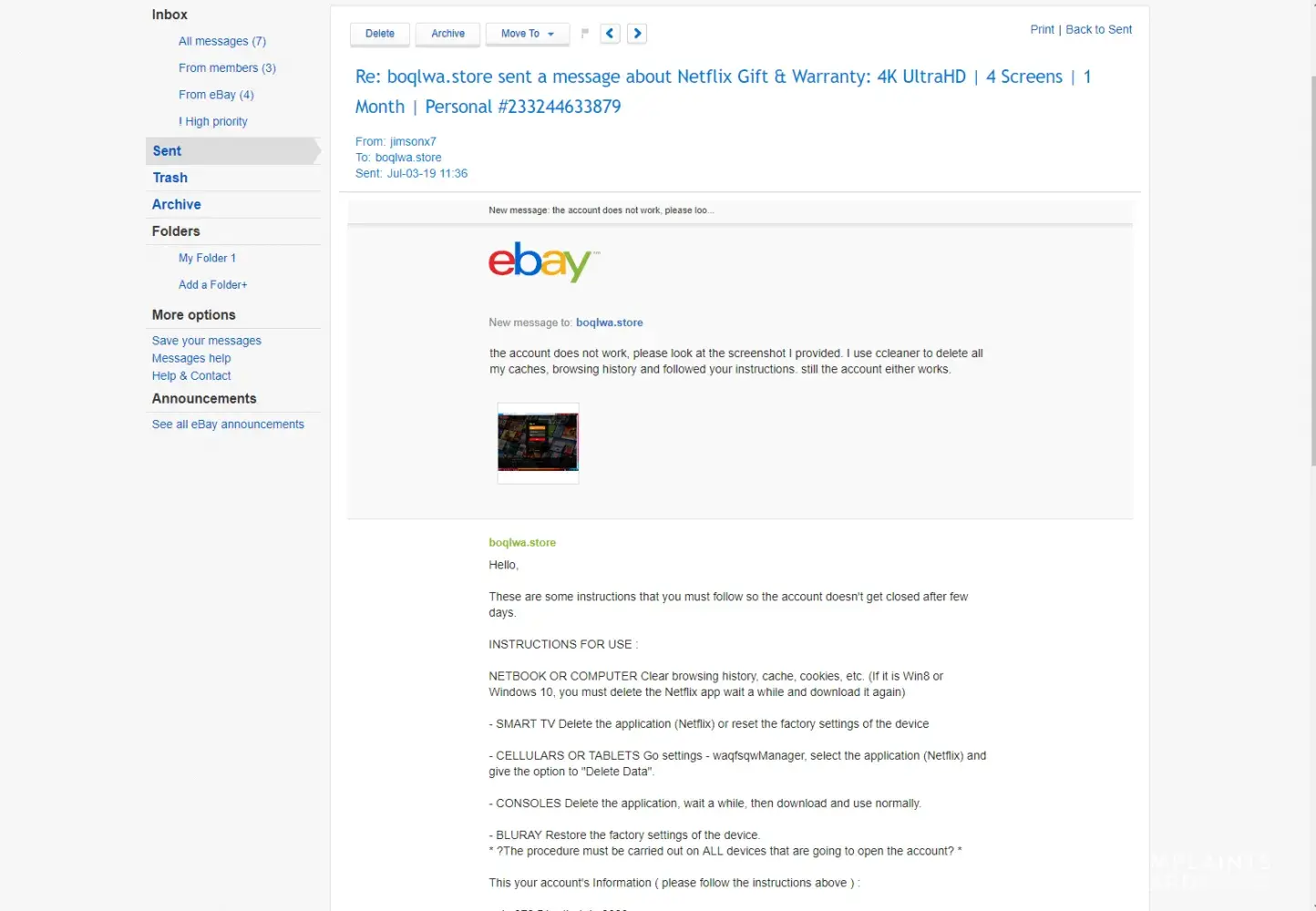 On this person's ebay store(boqlwa.store), he is selling these digital items: netflix accounts and the listing is called " Netflix Gift & Warranty: 4K UltraHD | 4 Screens | 1 Month | Personal " for $5 each.When I purchased from this seller, he sent me an ebay message with the "netflix account details" and notes that the "warranty will be voided if the e-mail is changed" This listing is a SCAM, Buyers like me that bought this has no power over the netflix account.The seller can change the login and password at anytime and say the buyer has changed the accounts details leaving the buyer with nothing.After I tested the netflix account credentials, I messaged him saying that the accounts details he sent me does not work and I provided a screenshot to him that the account doesn't even exist.He messaged me back saying "we both know that you changed the e-mail to the account." That doesn't even matter for the buyer because the seller can always change back the account details no matter what by doing a hard reset calling netflix company on the phone.On one of the his/her's other listings that sells netflix accounts it says 17 has sold in 1 hour, I JUST HATE TO SEE HIM/HER GETTING AWAY WITH THIS, THIS IS WRONG AND HAS TO BE STOPPED.HE'S MAKING A TON OF MONEY BY DOING THIS SCAM ON EBAY.Once the buyers give a positive feedback on ebay, there's no turning back, cannot edit the positive feedback. After the buyer puts a positive feedback, the seller can change the netflix account details and give the account details to the next victim so the victim can give a positive feedback saying it works, it's a scam cycle.This ebay seller has to be stopped, this is criminal. Even though it's only $5 each buy but it adds up very quickly, like seriously 17 sold in 1 hour and this seller is getting away with it. People is not reporting it because it's only $5 and left a positive feedback already so it's too late. Not me, I am the only buyer that left the seller a negative review.Below is the seller's ebay store. I know there are other netflix account listings out there but this is the seller I purchased from. STRAIGHT UP SCAM. He requested a partial refund of $1.99 but why am I giving him an extra $3 when I get nothing? He risked $5 for his first negative feedback.