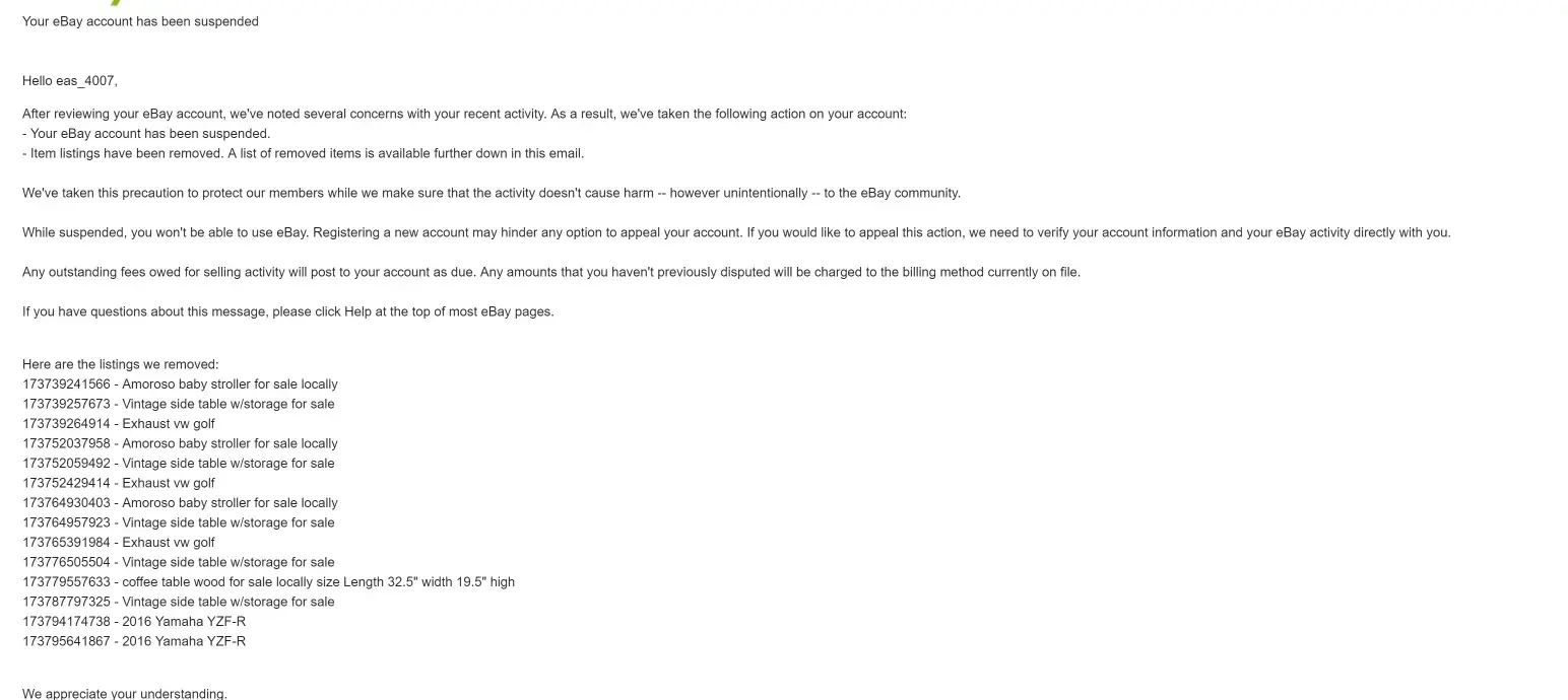 > We're writing to let you know that we've removed an item you recently won